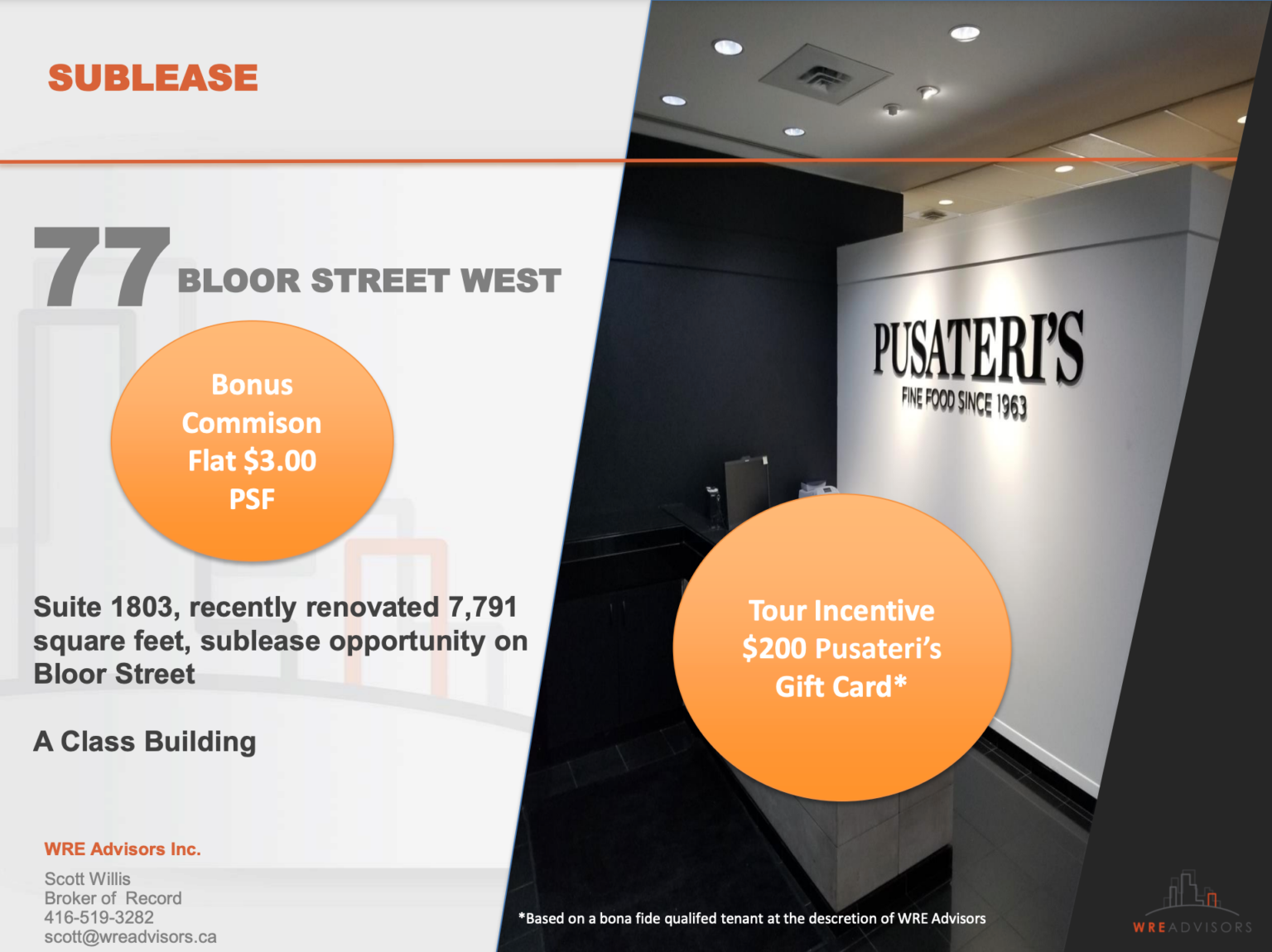 Details: Recently renovated 7,791 square feet, long-term sublease opportunity on Bloor Street West. Recently renovated space Open area – 8 offices – 2 meeting rooms – kitchen – IT room – reception A Class Building. BONUS Commission available (contact brokerage for details)